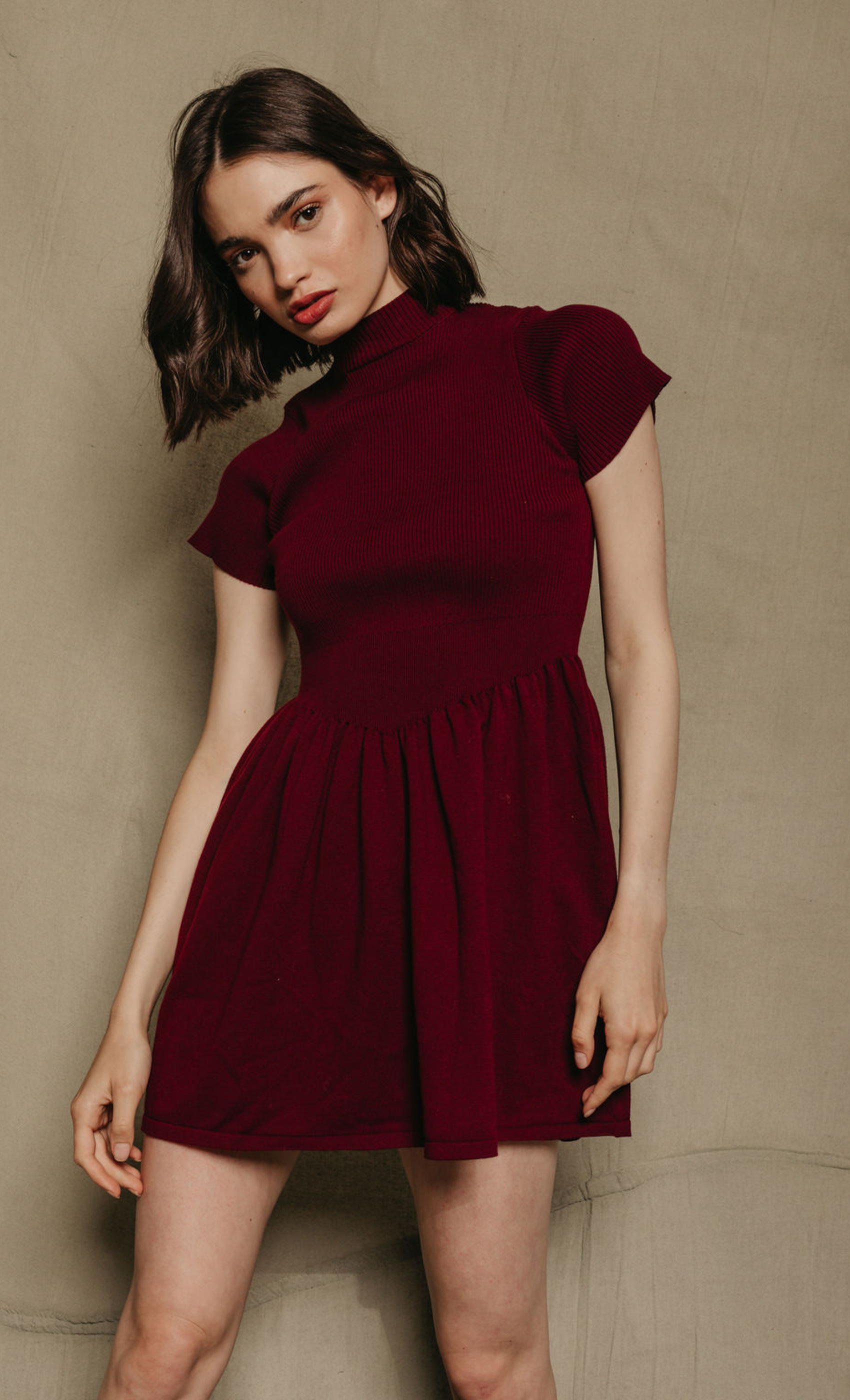 A modern take on cosy dressing. Our Burgundy Waist Detail Knit Mini Dress combines a fitted ribbed bodice with a softly flared skirt, creating a flattering hourglass silhouette. Crafted in a rich burgundy hue, it features a high neckline and short sleeves for a polished yet easy-to-wear finish. The cinched waist detail subtly shapes the figure, making it a standout piece that’s both comfortable and refined.