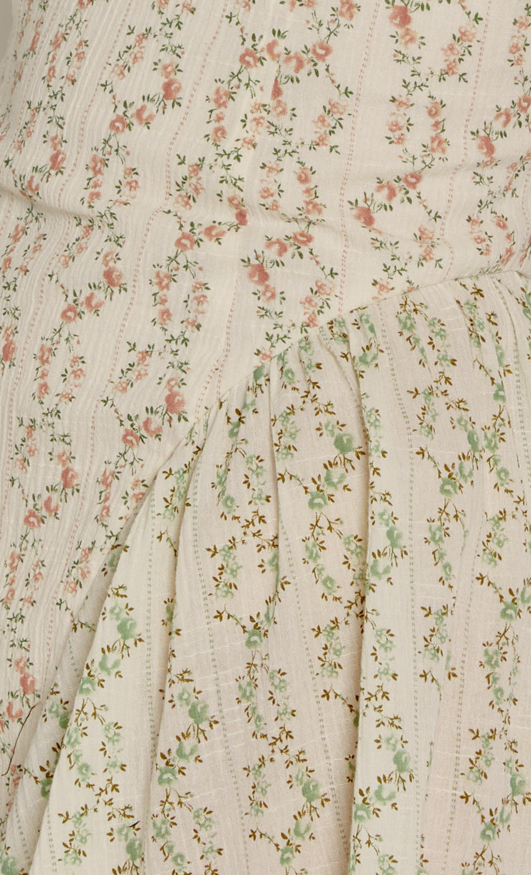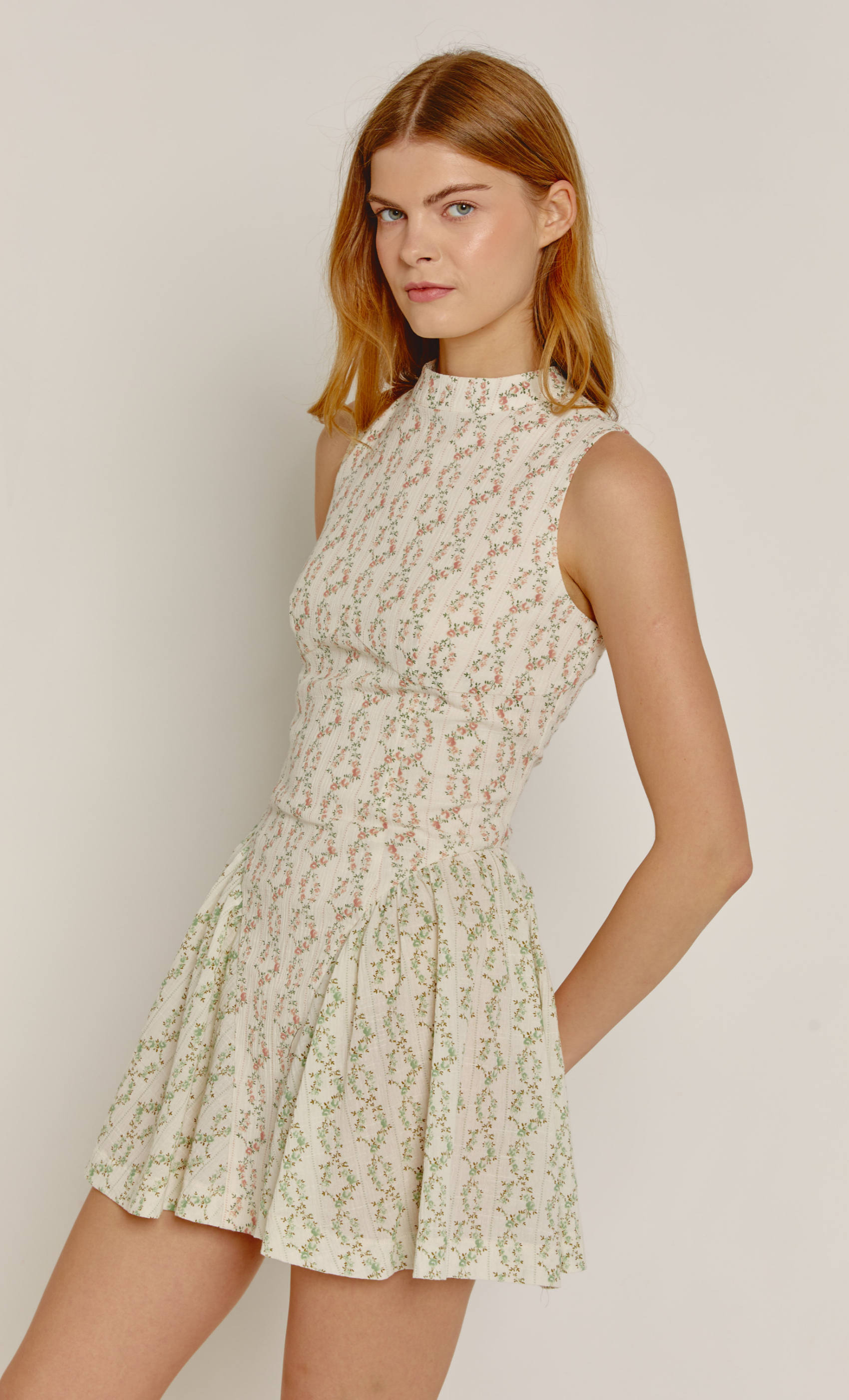 Designed with a romantic, vintage-inspired feel, the Cream Ditsy Floral High Neck Mini Dress features a high neckline and a structured bodice that creates a polished silhouette. A cream fabric adorned with delicate vertical stripes of pink and sage green botanical blooms for a classic cottagecore aesthetic. Finished with a sleeveless design and a pleated, voluminous skirt