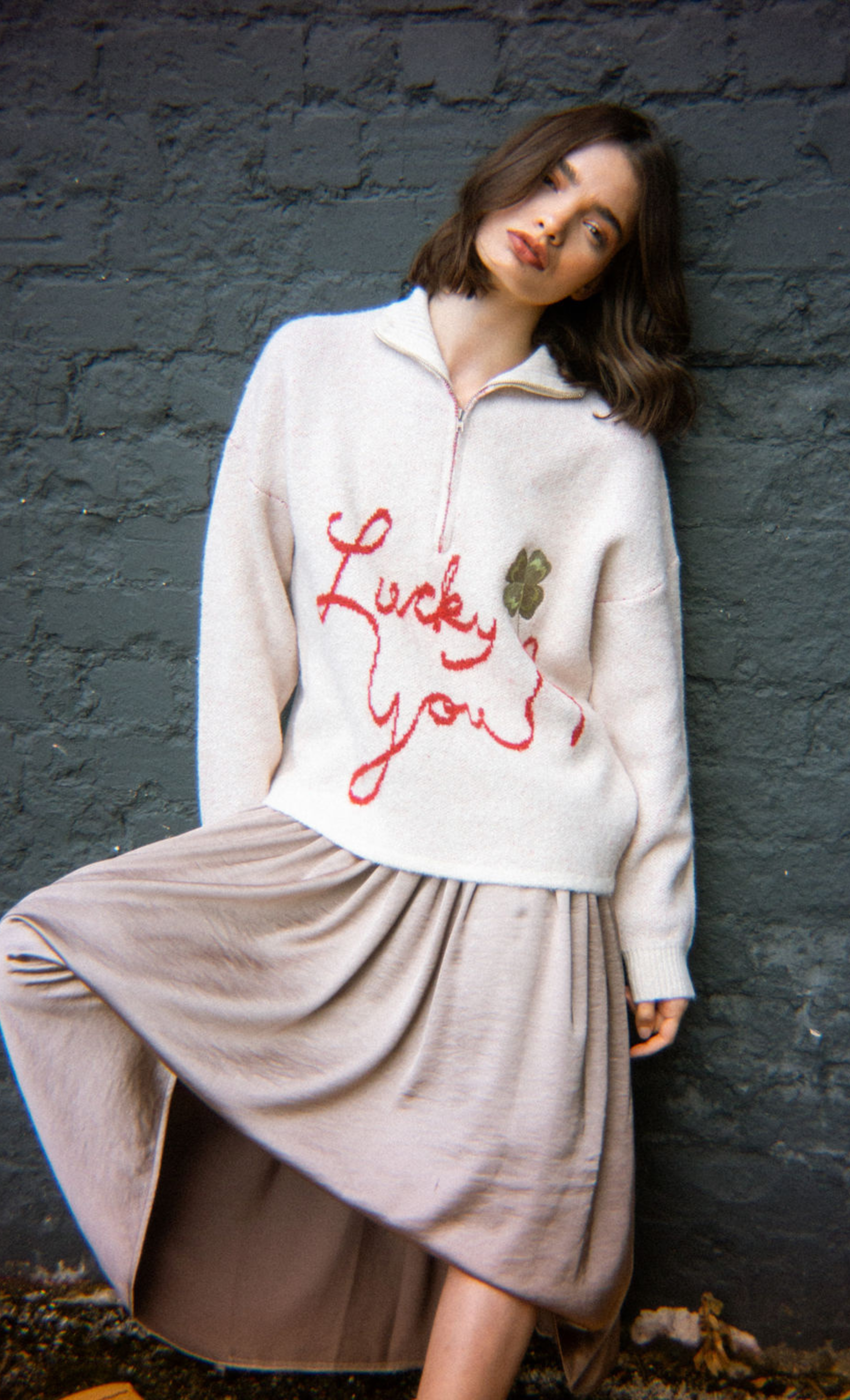 Cosy, cheeky, and just a little bit magic. Our "Lucky You" jumper brings feel-good energy to chilly days, with a bold slogan in vibrant red script and a sweet embroidered four-leaf clover for extra charm. Cut in a relaxed, slightly oversized fit with a chunky ribbed half-zip neckline—this is your statement knit for layering with jeans, skirts, or over dresses all season long.