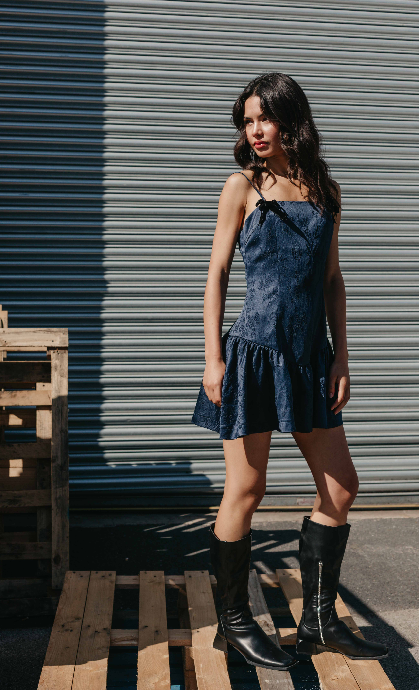 Make an entrance in our Navy Jacquard Velvet Bow Dress, designed to flatter with a fitted bodice and flared hem. Crafted from a rich satin jacquard fabric with a subtle floral pattern, this dress features delicate bow details on the straps and a soft sheen finish for an elegant touch. The playful silhouette and luxe texture make it the perfect choice for parties, date nights, or any occasion that calls for a little glamour.