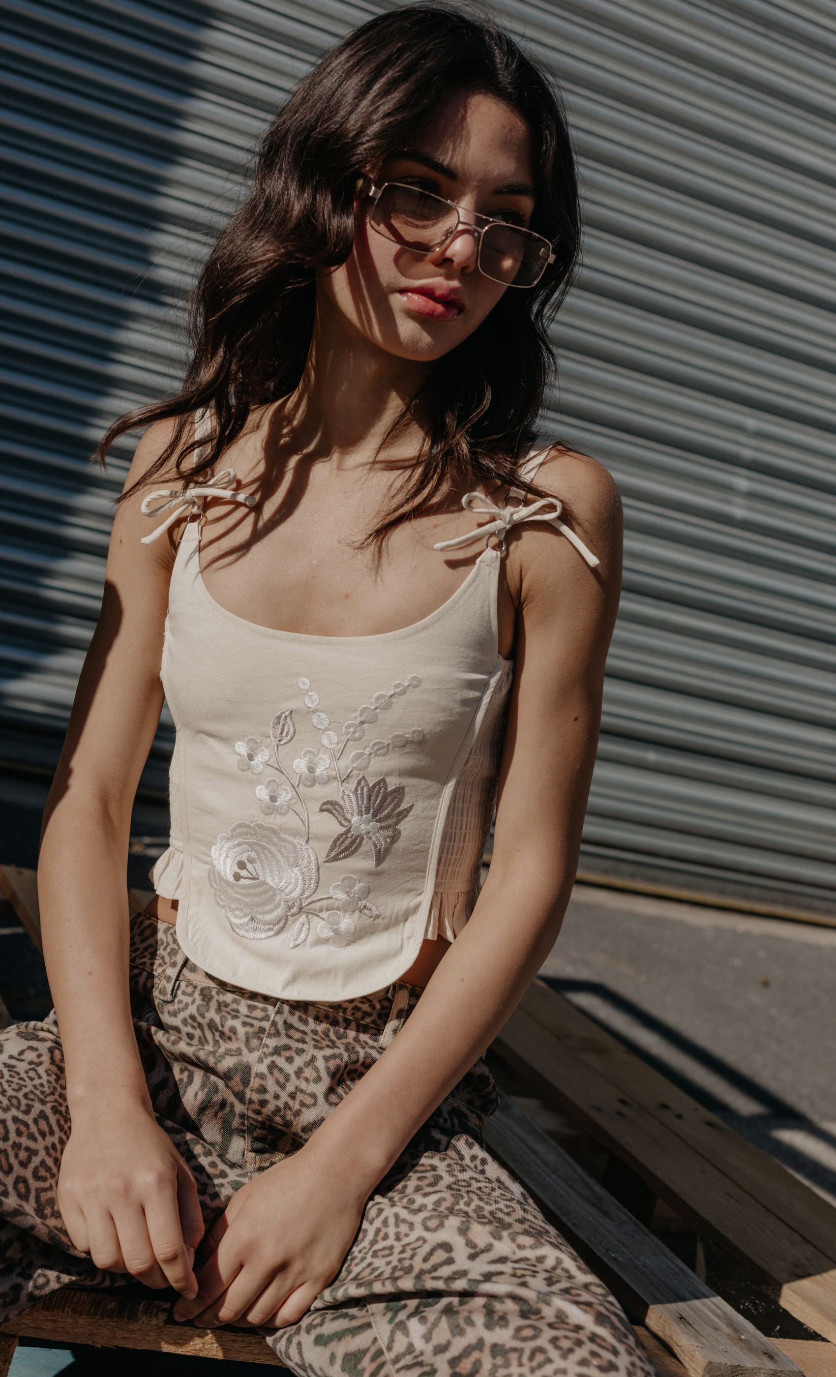 Feminine and dreamy, our cream floral embroidered corset top. This top is made from organic cotton and features dainty bow tie straps and beautiful embroidered detailing designed by our talented team. Wear as its own statement piece or pair with our matching skirt.
