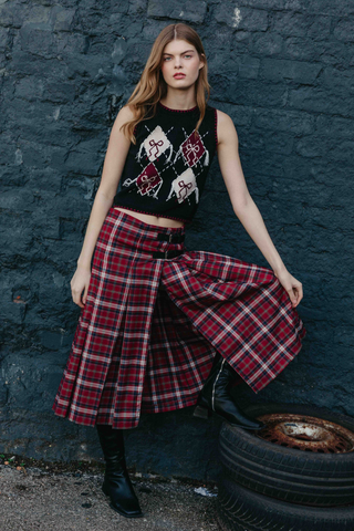 Red Check Midi Kilt Skirt
