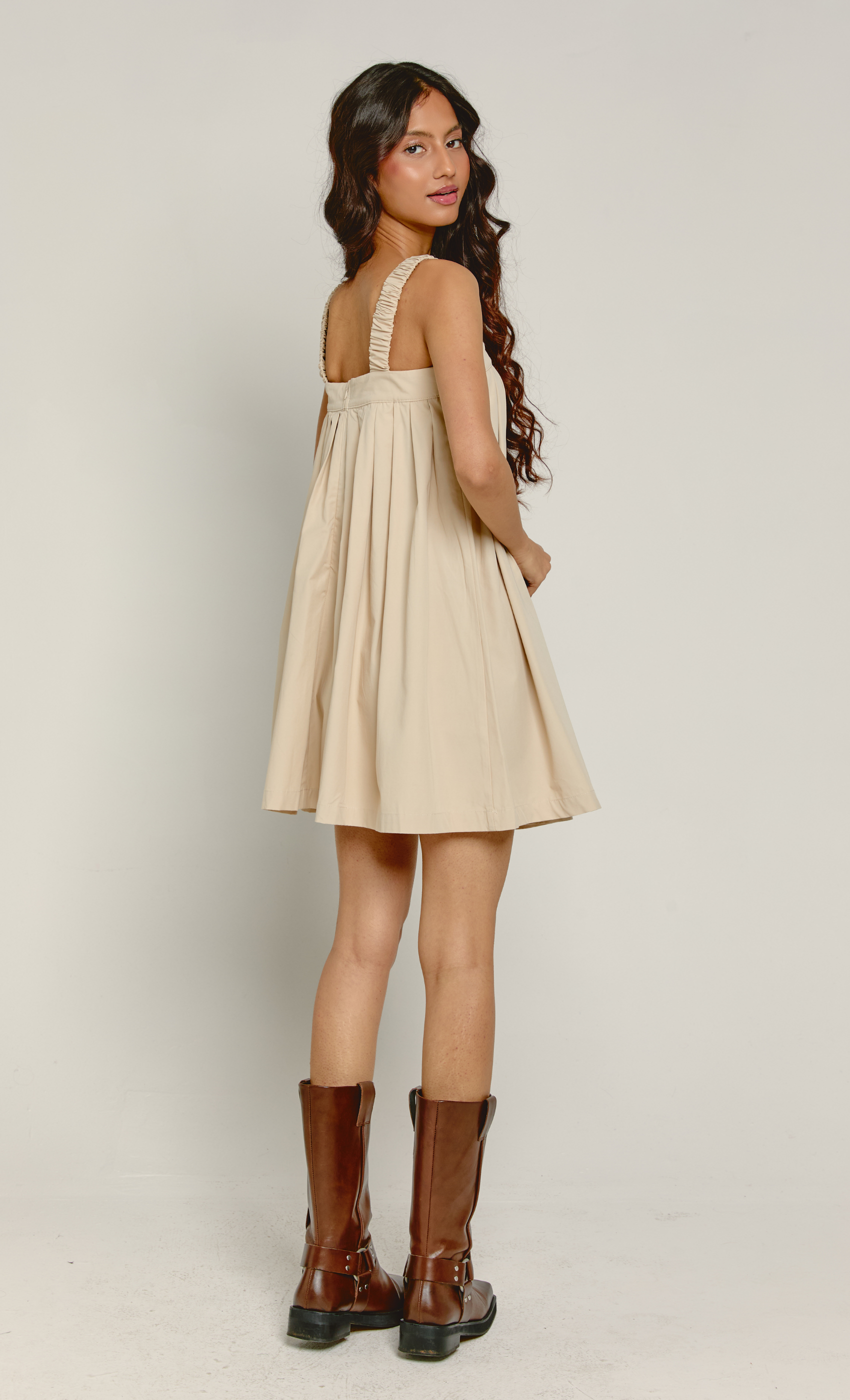 Playful, effortless, and ultra-chic—the Beige Pleated Babydoll Mini Dress is a wardrobe must-have. Featuring a voluminous silhouette with structured pleats, this dress brings a modern twist to a timeless style. The ruched elasticated straps add a soft, feminine touch, making it perfect for day-to-night dressing.